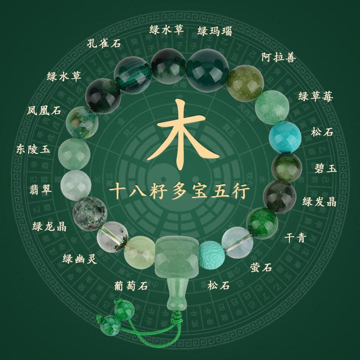 Comprising 18 carefully selected gemstones, this bracelet is available in designs for both men and women. It is ideal for individuals seeking to balance the wood element within their lives according to the principles of the Five Elements (Wu Xing). This bracelet can be harmoniously paired with wooden jewelry, necklaces, pendants, bracelets, and other accessories to enhance its energetic influence.